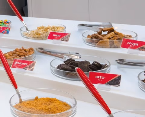 Yogurt Factory part d’un principe très simple : les grands classiques sont fait pour être détournés et revisités. L'enseigne a donc repris l’un des grands classiques de notre alimentation, le yaourt, et l’a rajeuni, rafraîchi, pour en faire du yaourt glacé : 0% de matière grasse et 100% gourmande sur laquelle chacun peut rajouter à sa guise des garnitures (toppings) telles que des fruits frais, des céréales, des coulis ou des biscuits en tout genre. Et chez Yogurt Factory, les toppings sont en quantités illimités ! Pour un prix fixe, vous pouvez ajouter autant de garniture que vous le souhaitez tant que cela rentre dans votre pot.